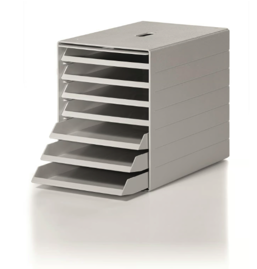 Praktisk och miljövänlig dokumentbox med 7 utdragbara lådor för enkel sortering och snabb åtkomst. Tillverkad av återvunnen plast och certifierad med Blue Angel.