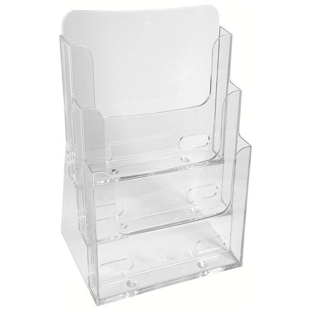 Visa era broschyrer snyggt och smart i detta ställ med 3 olika fack! Ett broschyrställ med tre fack för A4. Stället är tillverkat av klar polystyren. Levereras färdigmonterat. Helgjuten produkt – ingen montering krävs.