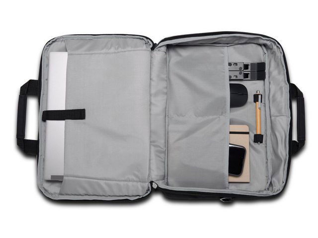 Laptopväskan är modern och resvänlig och har plats för laptops på upp till 16 tum (inklusive notebooks på 15,6 tum) och har ett vadderat fack. Ett fack framtill med dragkedja och flera fickor ger enkel åtkomst till viktiga papper och tillbehör. En vadderad axelrem ger stöd åt nacke och axlar och en väskrem gör att den enkelt kan fästas på bagage med hjul. Den frontmatade designen gör att säkerhetskontroller går smidigare.