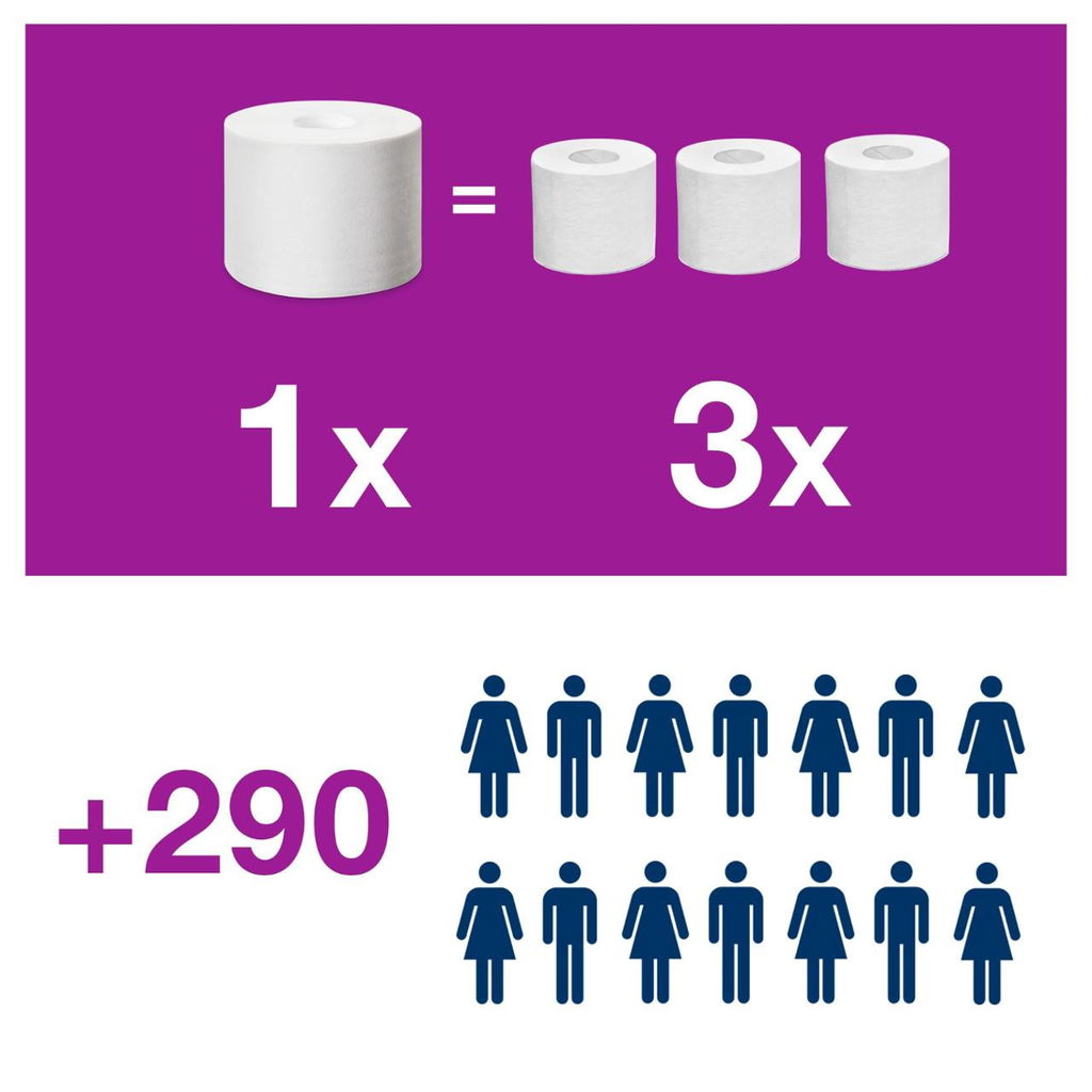Tork Dispenser Coreless Mid-size Twin Toalettpapper passar perfekt för toalettutrymmen med medelhög besöksfrekvens, där gästernas välbefinnande är extra viktigt. Den garanterar hög effektivitet och att toalettpapper alltid är tillgängligt för gästerna, eftersom den har plats för upp till nio gånger mer papper än två vanliga toalettpappersrullar.