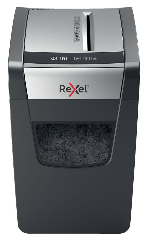 Med kraft att makulera mer! Rexel Momentum X410-SL dokumentförstörare makulerar upp till 10 ark i en inmatning med en kontinuerlig driftstid på 6 minuter och en smalare design, vilket gör den idealisk för användning i hemmet. X410-SL har anti-jam teknologi för att garantera en avbrottsfri makulering. P4 korsskärning 4x30 mm bitar. Tyst, med intuitiva touchkontroller för enkel hantering och en generös 15 liters avfallsbehållare (225 A4 ark). 2 års maskingaranti och 2 års skärhuvudgaranti (Oljeark Rexel måste användas kontinuerligt för att produkten skall täckas av garantin, se mer information i manualen som följer med dokumentförstöraren).
