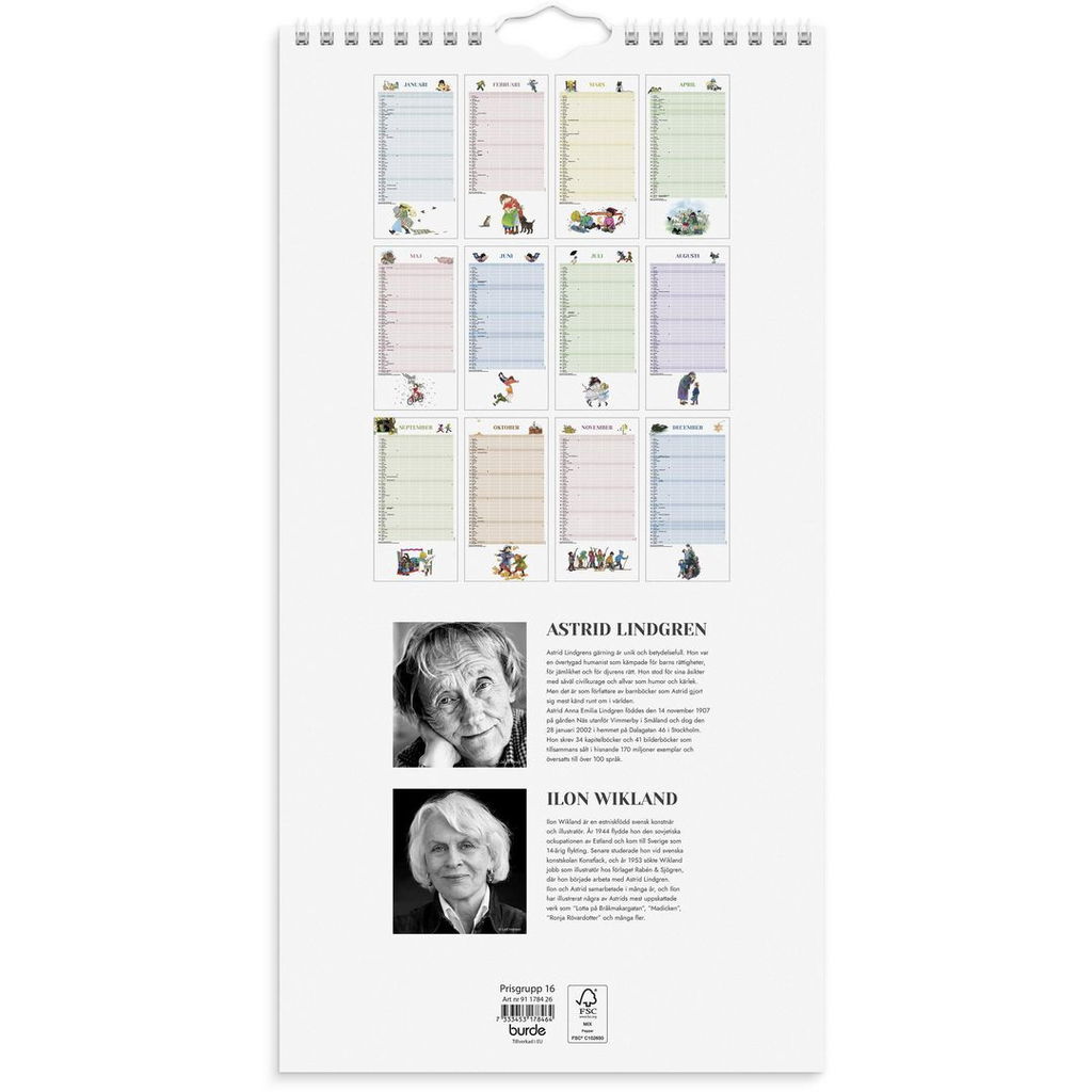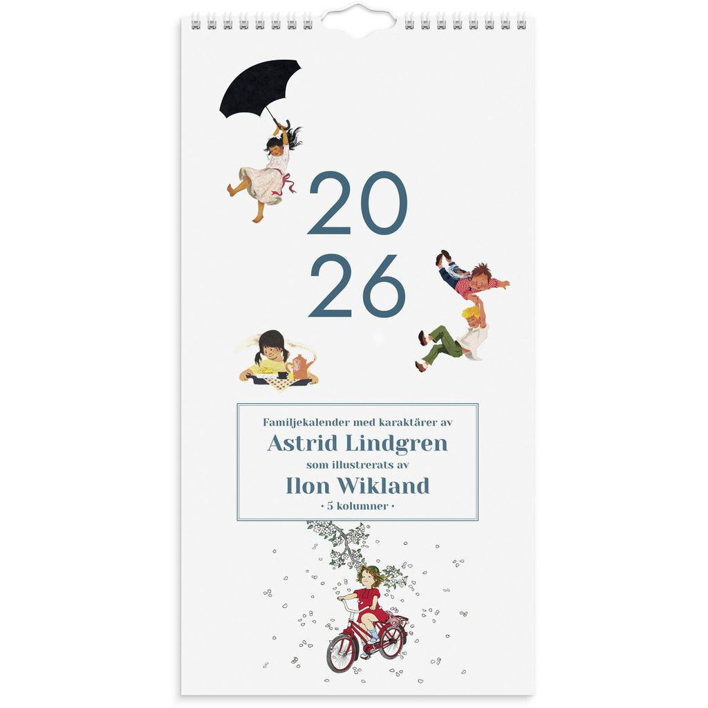En väggkalender med fem kolumner för att lättare kunna planera och organisera ditt livspussel, du kan själv skapa kalenders funktion utifrån dina behov. Antingen dela in livet i aktiiviteter, matlistor, födelsedagar eller dela in den utifrån familjemedlemmarna i hemmet. Vad om passar bäst i just ert hem. Kalenderns design visar illustrationer gjorda av Ilon Wikland över sagofigurer som har skapats och berättats av Astrid Lindgren.