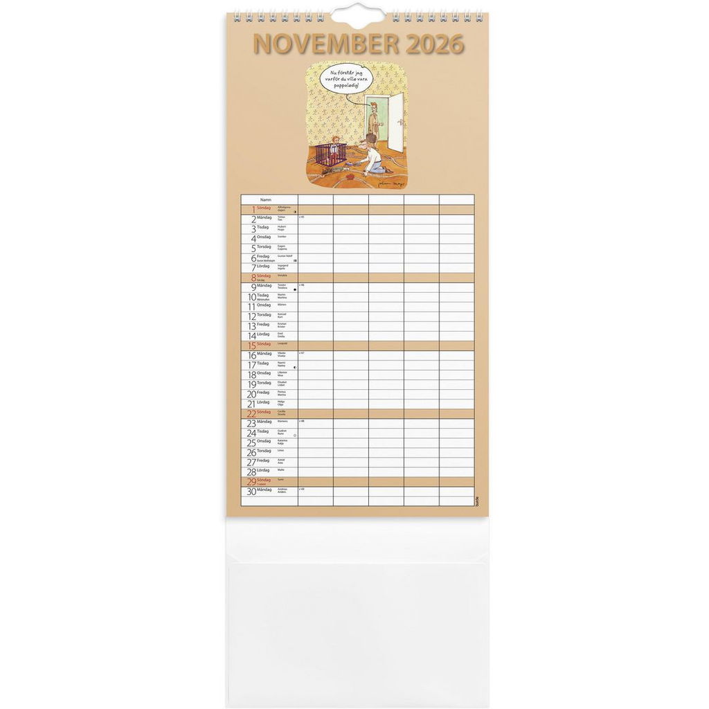 Kalender med fem kolumner för namn och anteckningar. En månad per blad. Spiralbunden med praktisk förvaringsficka i papper.