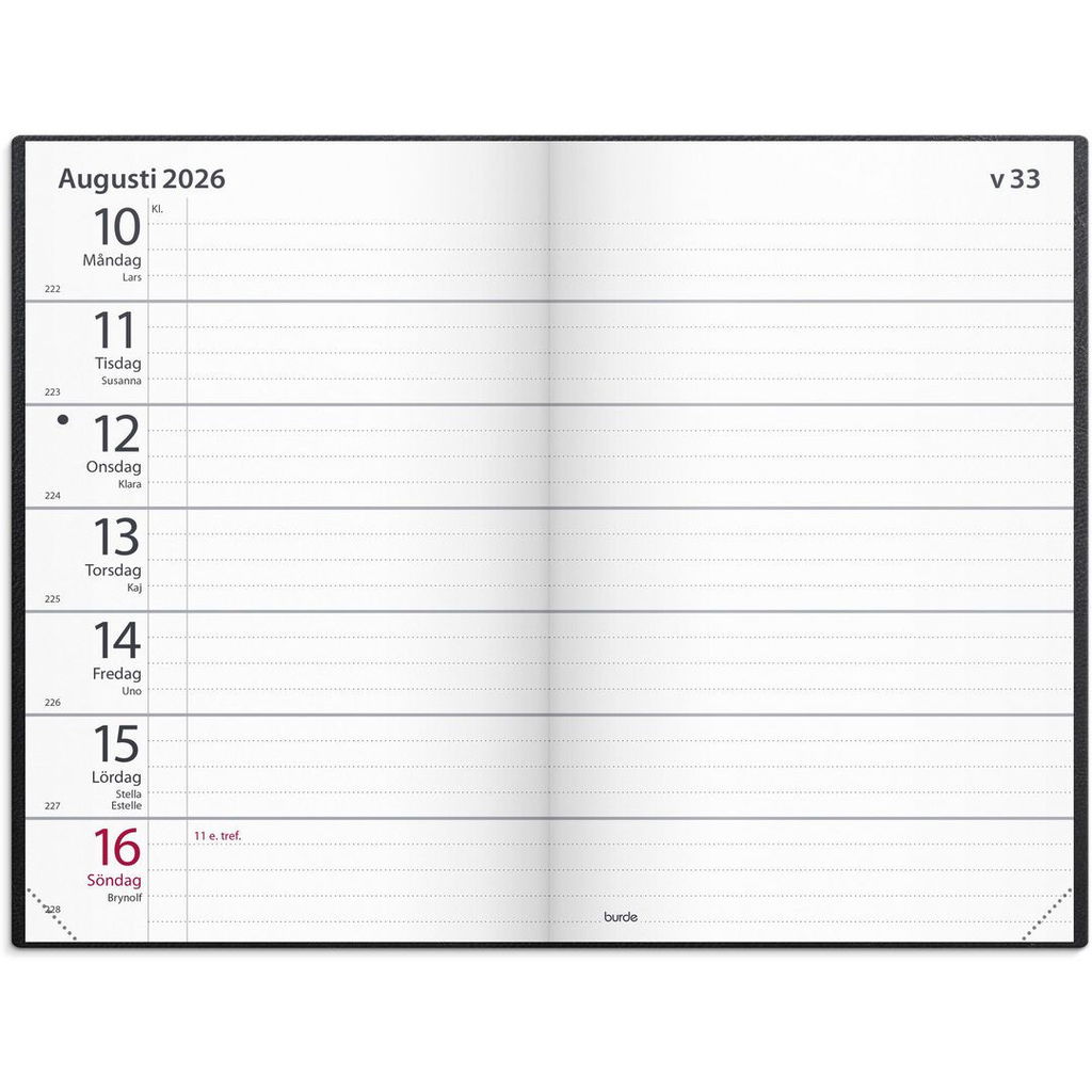 Format: 82x127 mm. Layout: Liggande. Vecka/uppslag. Kalendarium: 2025-12-15 - 2027-01-03. Omslag: Konstläder. Inbunden. Innehåll: Atlas, Kyrkliga helgdagar, Flaggdagar, Helgdagar/aftnar, Månfaser, Namnsdagar, Internationella helgdagar översikt, Löst telefonregister, Temadagar/händelser, Årsöversikt/årsöversikter, Årsplan/årsplaner. Antal sidor: 168. Miljöinformation:FSC®.