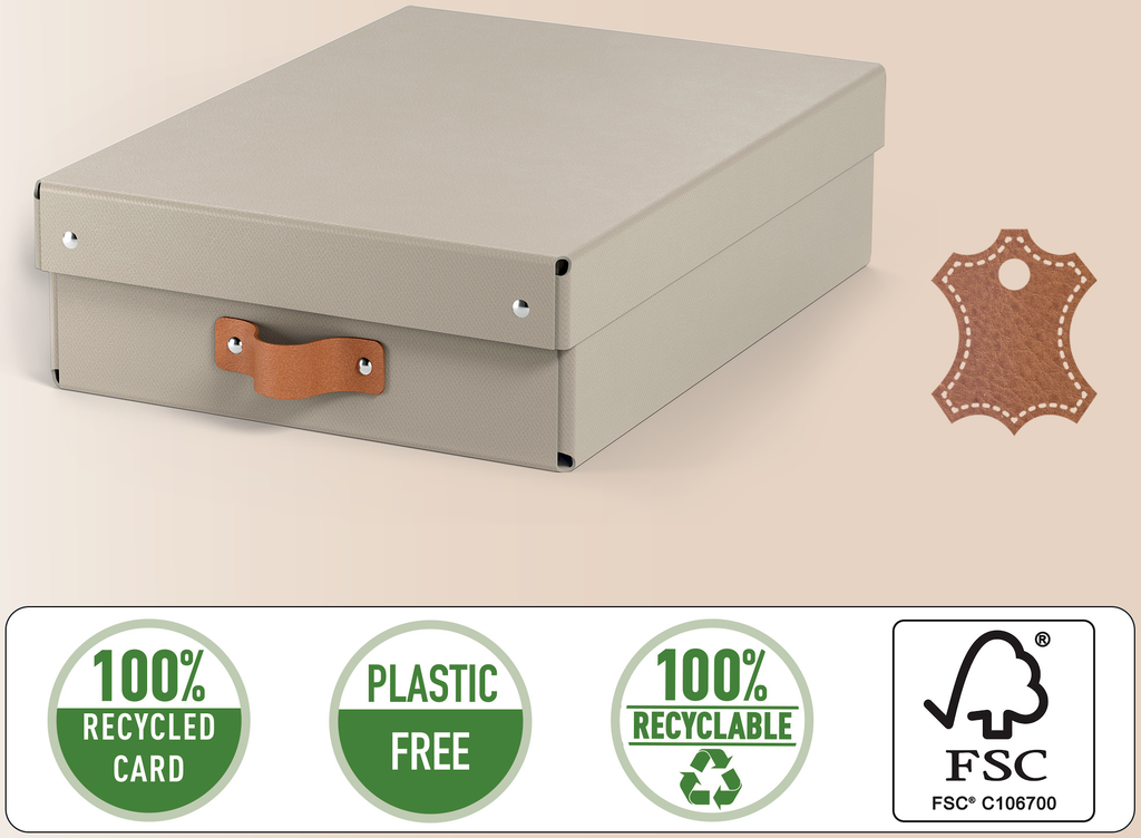 Setet innehåller två medelstora låga förvaringslådor med lock, tillverkade av 100% pre-consumer återvunnen FSC-certifierad kartong med en stilren design som passar både hem och kontor. Lådorna har en kapacitet på 8 liter och lämpar sig för A4-dokument, 14-tums bärbara datorer, hobby- och pysseltillbehör, leksaker och garderobstillbehör. Starkt material med maxvikt 4 kg gör det möjligt att stapla lådorna för platsbesparande förvaring. Levereras platt packad i plastfri förpackning och monteras enkelt utan verktyg.