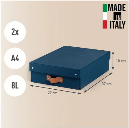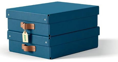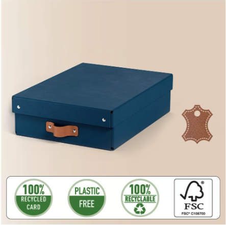 Setet innehåller två medelstora låga förvaringslådor med lock, tillverkade av 100% pre-consumer återvunnen FSC-certifierad kartong med en stilren design som passar både hem och kontor. Lådorna har en kapacitet på 8 liter och lämpar sig för A4-dokument, 14-tums bärbara datorer, hobby- och pysseltillbehör, leksaker och garderobstillbehör. Starkt material med maxvikt 4 kg gör det möjligt att stapla lådorna för platsbesparande förvaring. Levereras platt packad i plastfri förpackning och monteras enkelt utan verktyg.