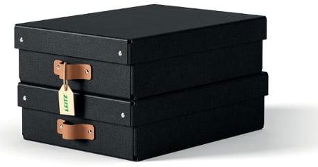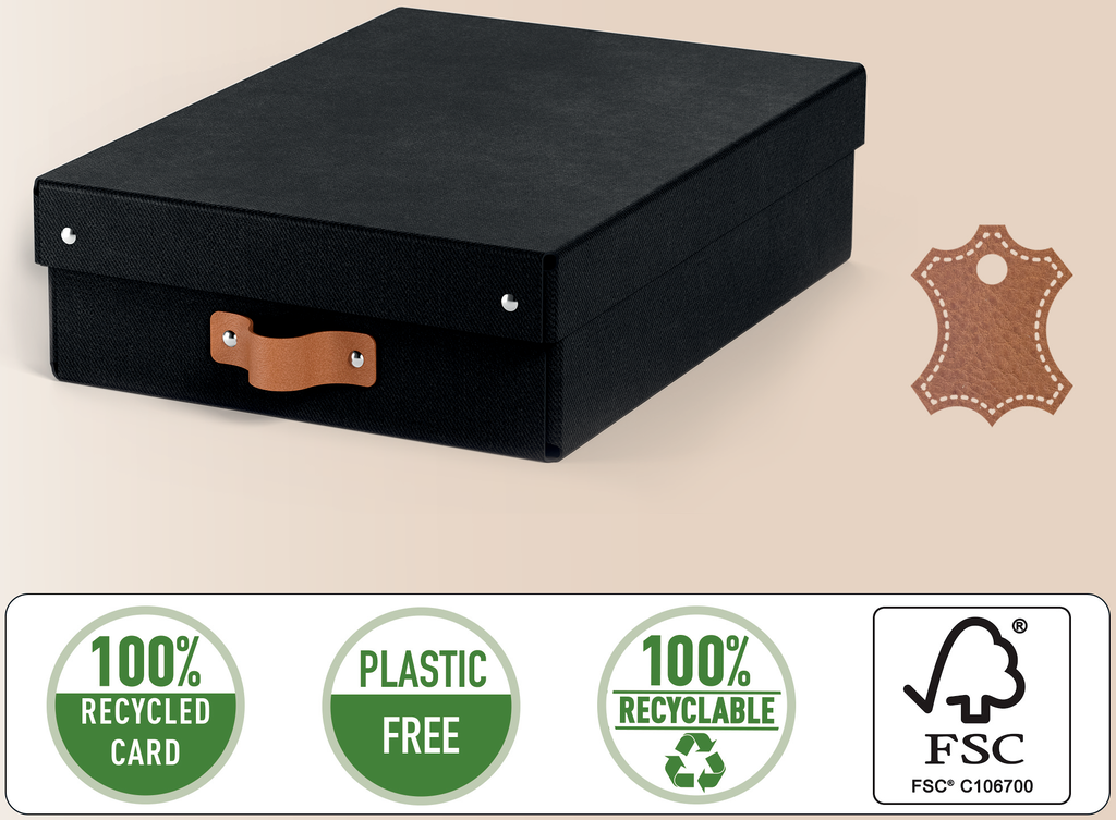 Setet innehåller två medelstora låga förvaringslådor med lock, tillverkade av 100% pre-consumer återvunnen FSC-certifierad kartong med en stilren design som passar både hem och kontor. Lådorna har en kapacitet på 8 liter och lämpar sig för A4-dokument, 14-tums bärbara datorer, hobby- och pysseltillbehör, leksaker och garderobstillbehör. Starkt material med maxvikt 4 kg gör det möjligt att stapla lådorna för platsbesparande förvaring. Levereras platt packad i plastfri förpackning och monteras enkelt utan verktyg.