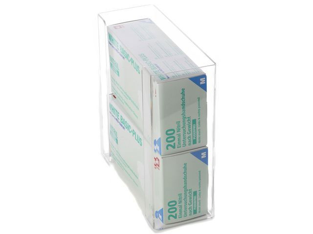 Med ett enhandsgrepp garanterar den användaren en snabb och enkel tillgång till nya handskar. Rymmer två askar. Bredd: 27,5 cm Höjd: 28,5 cm Djup: 10,5 cm Vikt: 0,4 kg
