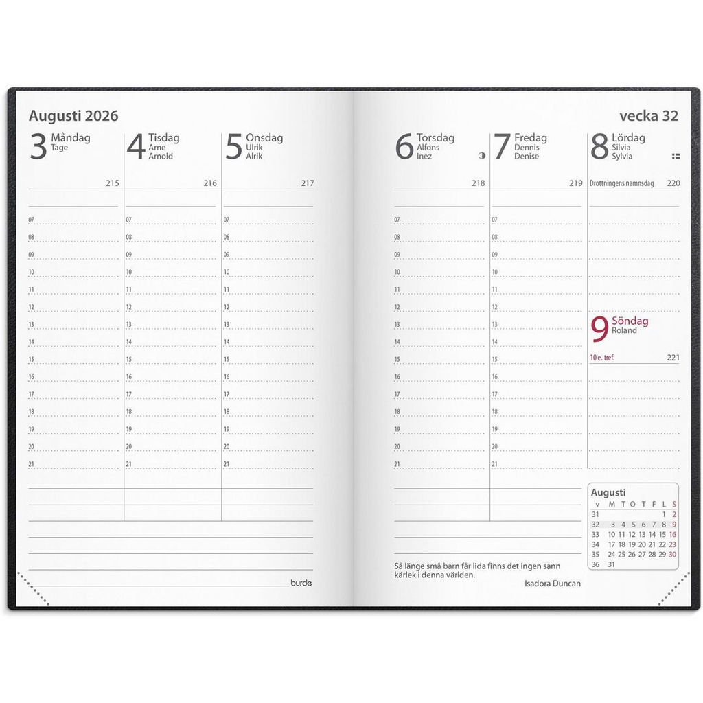 - Layout: Stående. Vecka/uppslag. Timindelning 7-21