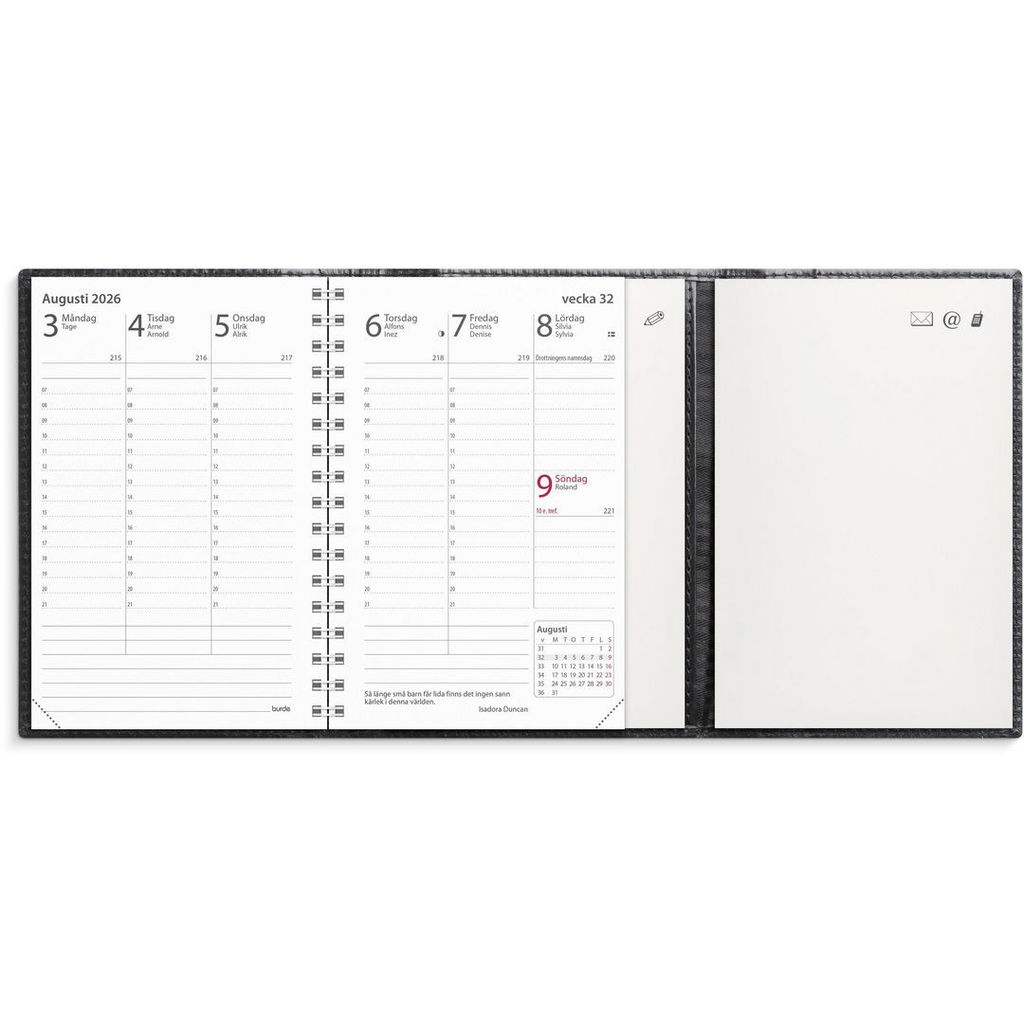 - Innehåll: Atlas, Kyrkliga helgdagar, Flaggdagar, Helgdagar/aftnar, Månfaser, Namnsdagar, Anteckningshäfte, Internationella helgdagar översikt, Telefonregister, Temadagar/händelser, Årsöversikt/årsöversikter, Årsplan/årsplaner