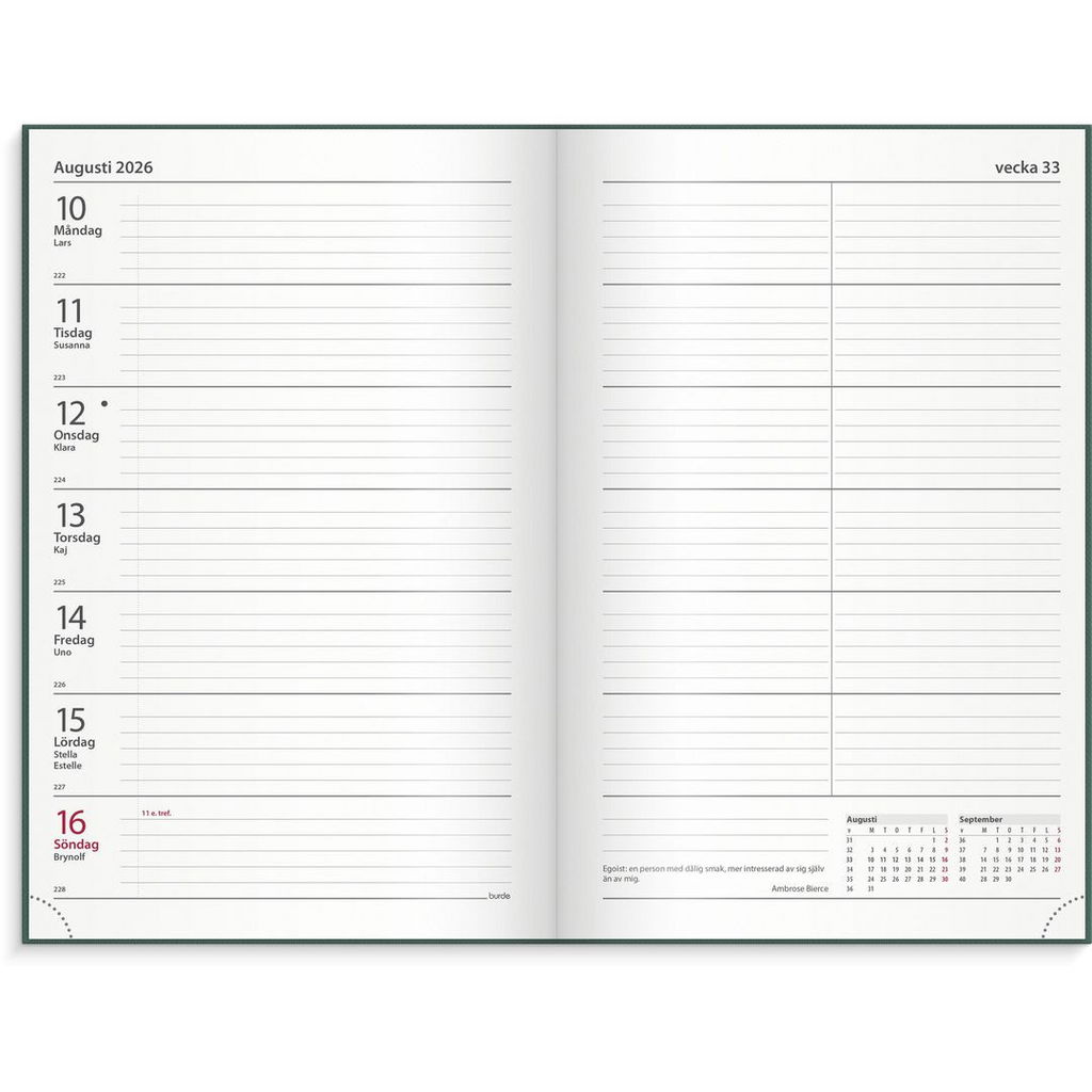 Inbunden kalender med en vecka per uppslag, praktiskt märkband samt årsplaner för innevarande och följande år