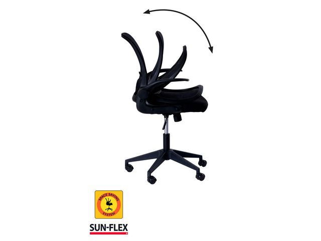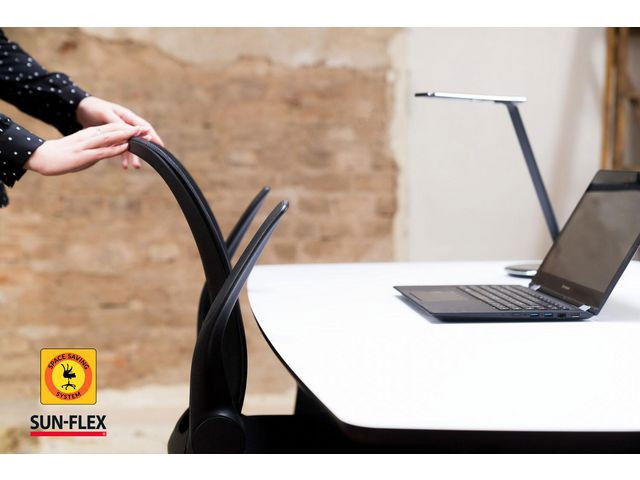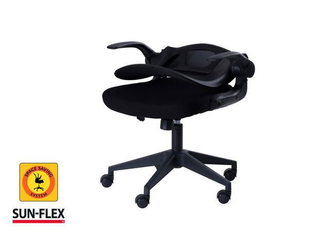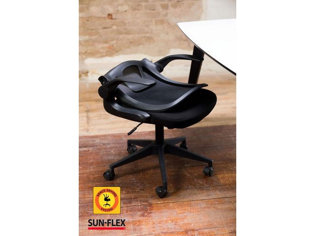 Den är också ett ypperligt val vid aktivitetsbaserade arbetsplatser då den är enkel att förvara. Tack vare det utvecklade SPACE SAVING SYSTEM från SUN-FLEX, med unika fällbara lösningar för både rygg och armstöd, ges möjlighet till extra yta då man inte sitter ner och arbetar. Förvaringen tar liten plats när stolen ej används då den enkelt fälls ihop och placeras under skrivbordet eller på annat lämpligt ställe.