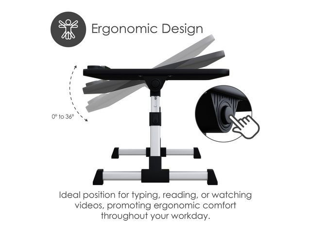 Ergonomi är avgörande för ett arbetsredskap som kräver konstant användning. Genom att få den perfekta installationen kan du lätta på onödiga påfrestningar på nacken eller ryggen och njuta av längre timmar av produktivitet eller nöje. Det är lätt att ställa in också. Upplev friheten med en bärbar arbetsyta som passar alla bärbara datorer, e-boksläsare eller surfplattor.