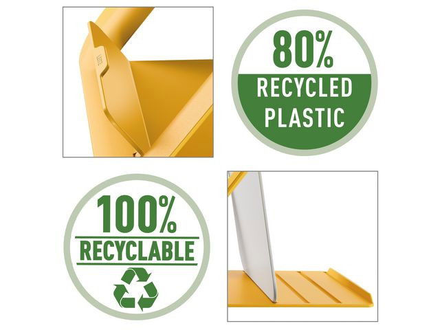 Tillverkad av 80% post-consumer återvunnen plast, produkten kan demonteras genom att metalldelar separeras från plast för 100% återvinning. Hög kvalitet och lång livslängd för att hjälpa till att bevara jordens resurser. Att använda ett laptopställ främjar också luftflödet, vilket håller din laptops batteri och andra komponenter svala för att upprätthålla höga prestandanivåer. Med sin minimalistiska och färgglada design förbättrar det här eleganta laptopstativet både hälsa och välbefinnande genom att enkelt skapa den perfekta aktiva arbetsmiljön.