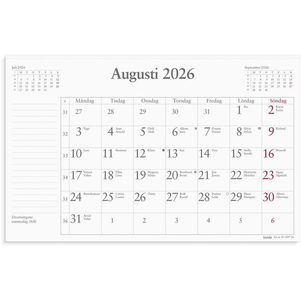 Kalender 2026 från Burde. Format: 240x152 mm. Layout: Månad/blad. Kalendarium: 2026-01-01 - 2026-12-31. Häftklamrad. Innehåll: Flaggdagar, Helgdagar, Månfaser, Namnsdagar. Antal sidor: 24. Miljöinformation: FSC®.