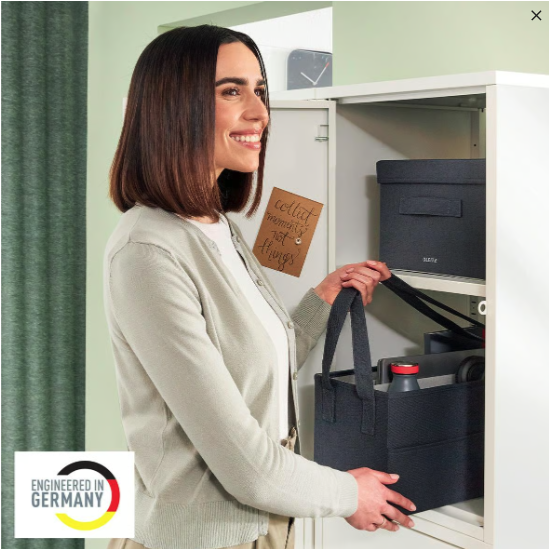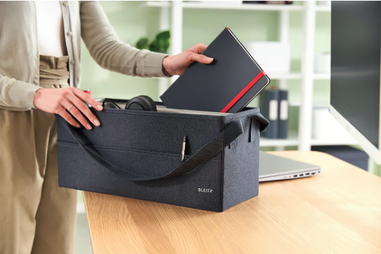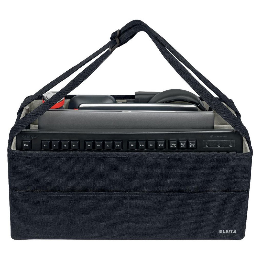 Gör dig hemmastadd vart än din dag tar dig med Fabric Storage-serien från Leitz. Håll ordning på kontoret, hemma och överallt däremellan. En förvaringsväska med tillräckligt med utrymme för laptop, tangentbord, mus, laddare, headset, anteckningsbok och en vattenflaska.