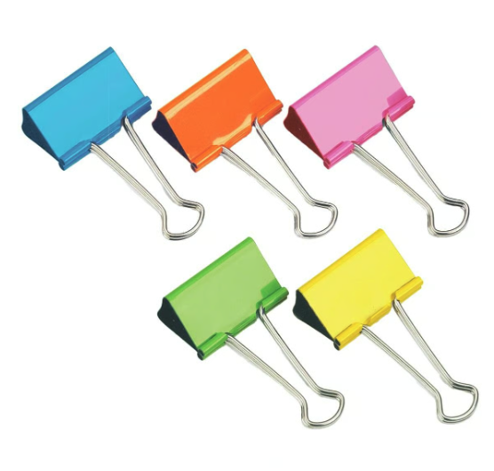 Pappersklämma av bockad metall. Handtagen kan vikas framåt vid buntning och bakåt för upphängning. Blandade färger. 10 st/fp. 41 mm.