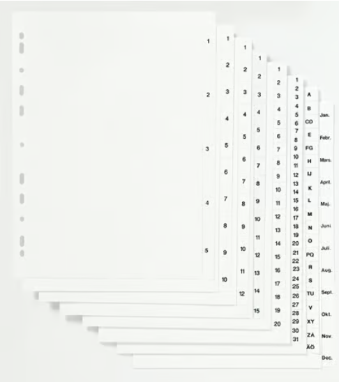Dessa förtryckta register är användarvänliga, stabila och ger enkel indexering och identifiering av innehållet i dina anteckningsböcker, pärmar och mappar. Registret har försättsblad av papper och förtryckta flikar så att du snabbt kan identifiera och hitta rätt material. Den hållbara plastkonstruktionen tål dagligt slitage och kan enkelt flyttas tack vare universalstansningen som fungerar med alla pärm- och arkiveringssystem.