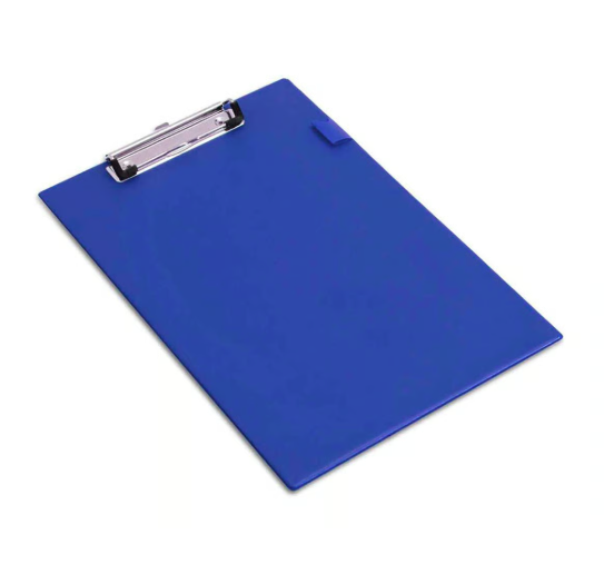 Skrivplatta av plast med klämfäste och pennhållare. Hål för upphängning. Blå.