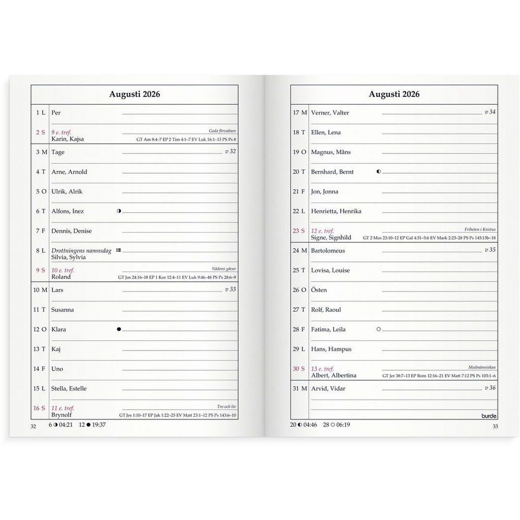 Kalender där du kan följa solens och månens upp- och nedgång varje dag vid sex olika horisonter. Den innehåller fakta om planeternapå himlen för varje månad och blandade uppgifter om Sverige.Kalender 2026 från Burde. Format: A6. Layout: Månad/uppslag. Kalendarium: 2026-01-01 - 2026-12-31. Omslag: Kartong. Häftklamrad. Innehåll: Kyrkliga helgdagar, Flaggdagar, Helgdagar/aftnar, Månfaser, Namnsdagar, Temadagar/händelser, Årsöversikt/årsöversikter. Antal sidor: 80. Miljöinformation: FSC®.