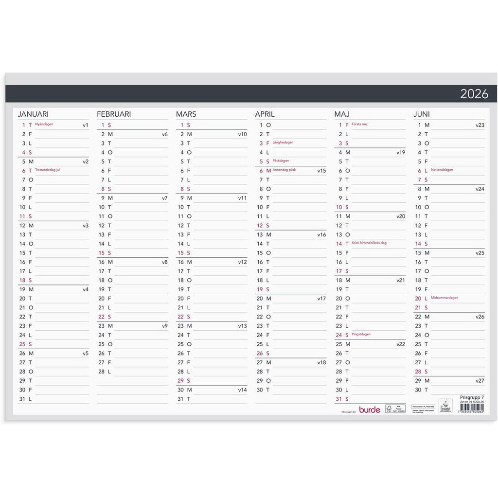Väggkalender 2026 från Burde. Format: A3. Layout: Halvår/sida. Kalendarium: 2026-01-01 - 2026-12-31. Innehåll: Helgdagar, Anteckningssidor, Årsplan/årsplaner. Antal sidor: 2. Miljöinformation: FSC®. Ecolabel.
