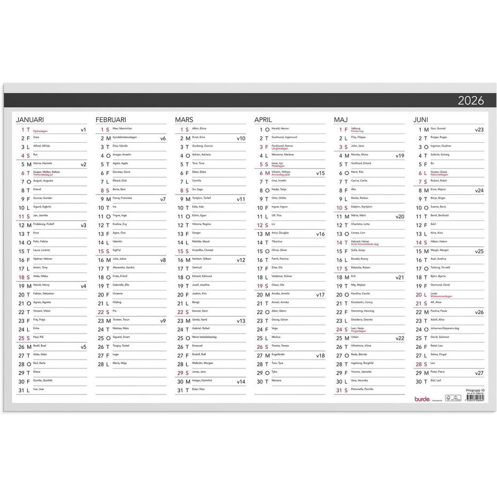 Väggkalender 2026 från Burde. Format: 600x400 mm. Layout: Halvår/sida. Kalendarium: 2026-01-01 - 2026-12-31. Innehåll: Helgdagar, Namnsdagar, Anteckningssidor, Årsplan/årsplaner. Antal sidor: 2. Miljöinformation: FSC®.