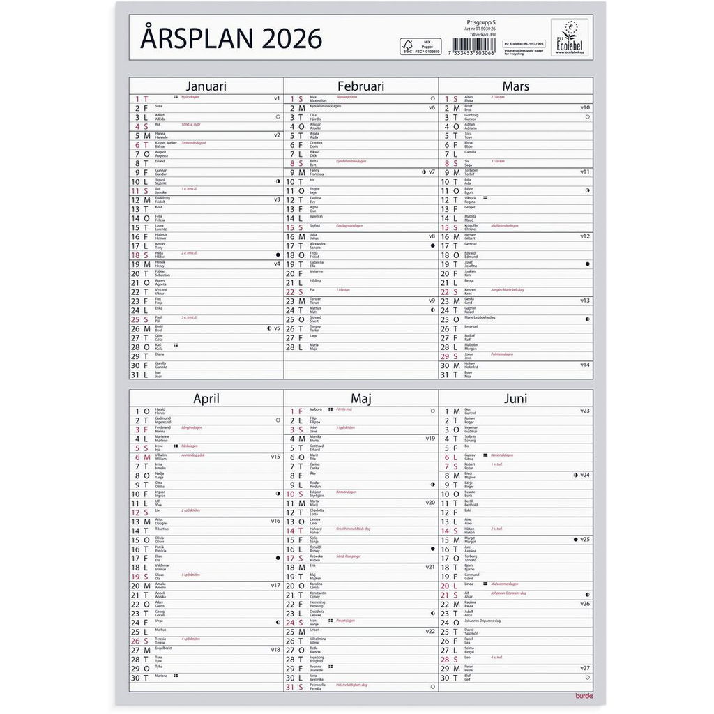Väggkalender 2026 från Burde. Format: 230x330 mm. Layout: Halvår/sida. Kalendarium: 2026-01-01 - 2026-12-31. Innehåll: Kyrkliga helgdagar, Flaggdagar, Helgdagar, Månfaser, Namnsdagar, Anteckningssidor, Årsplan/årsplaner. Antal sidor: 2. Miljöinformation: FSC®. Ecolabel.