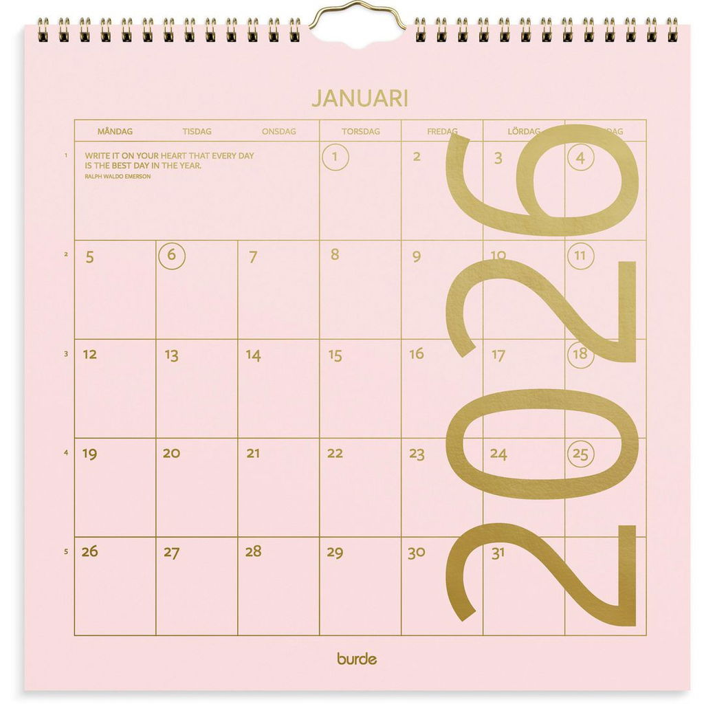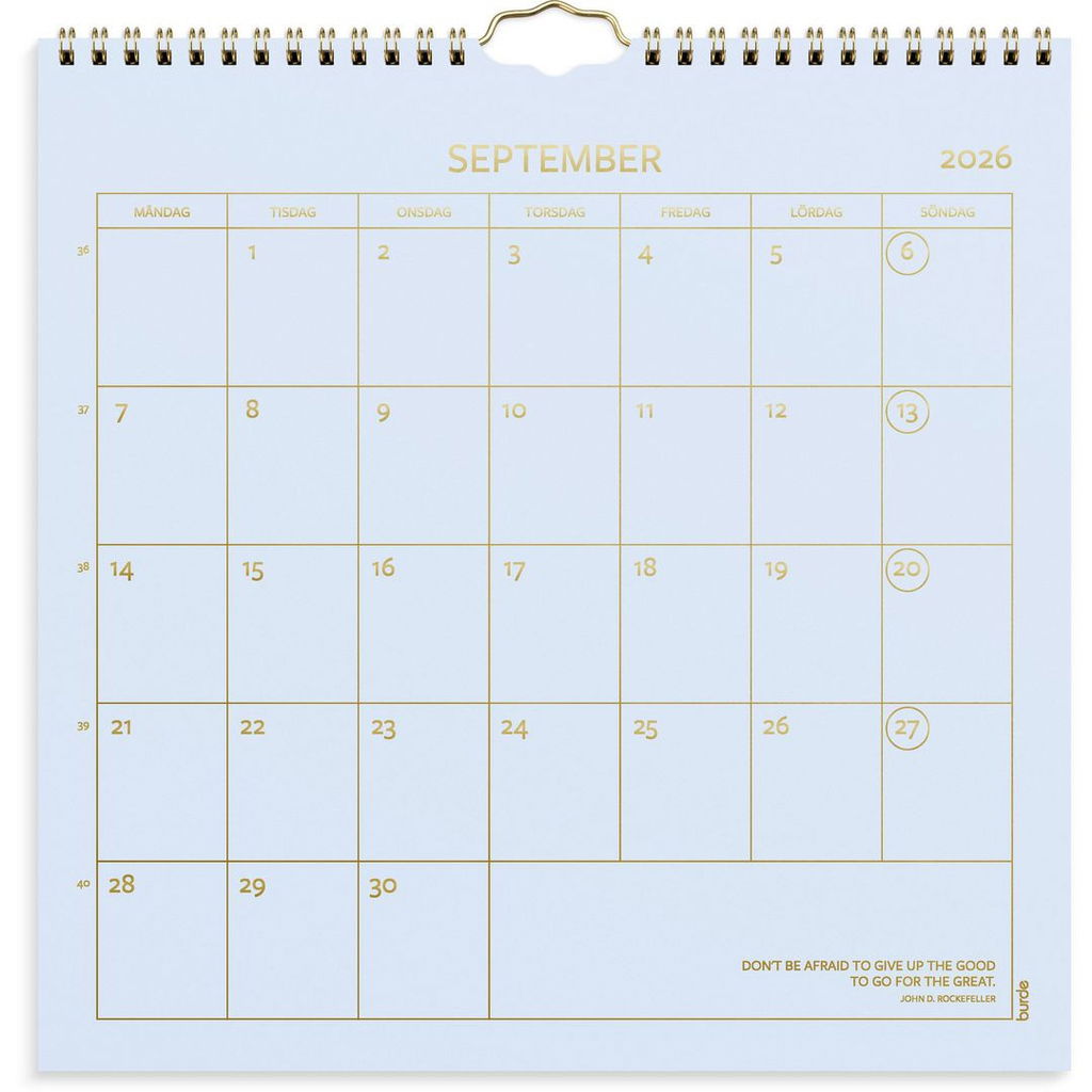 Format: 300x300 mm. Layout: Månad/blad. Kalendarium:2026-01-01 - 2026-12-31. Spiralbunden. Innehåll: Helgdagar, Årsöversikt/årsöversikter. Antal sidor: 12. Miljöinformation: FSC®.