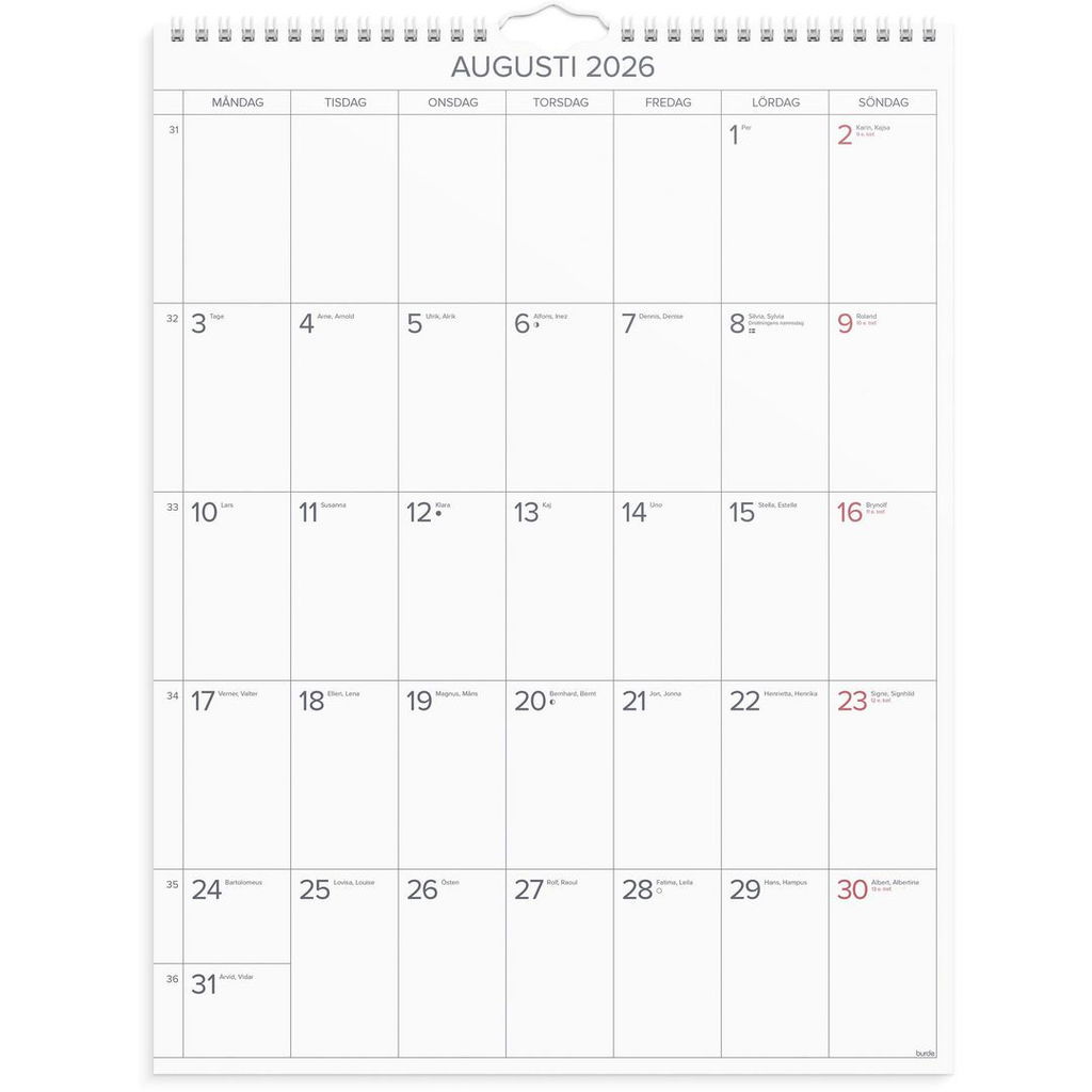 Väggkalender 2026 från Burde. Format: 295x390 mm. Layout: Månad/blad. Kalendarium: 2026-01-01 - 2026-12-31. Spiralbunden. Innehåll:Kyrkliga helgdagar, Flaggdagar, Helgdagar/aftnar, Månfaser, Namnsdagar, Temadagar/händelser, Årsöversikt/årsöversikter. Antal sidor: 12. Miljöinformation: FSC®.