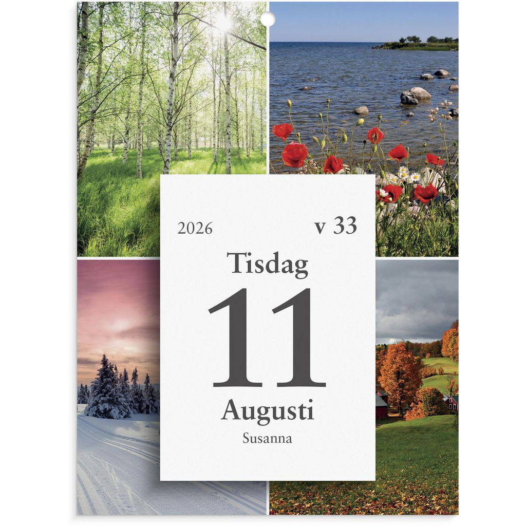 Följ året genom att riva av blad efter blad. Kalendern har ett väggplån som bakstycke med bilder på de fyra årstiderna och ett dagblock. Dagblocket har en vardag per blad och lördag och söndag på samma blad och är limbundet med klammerbaksida.