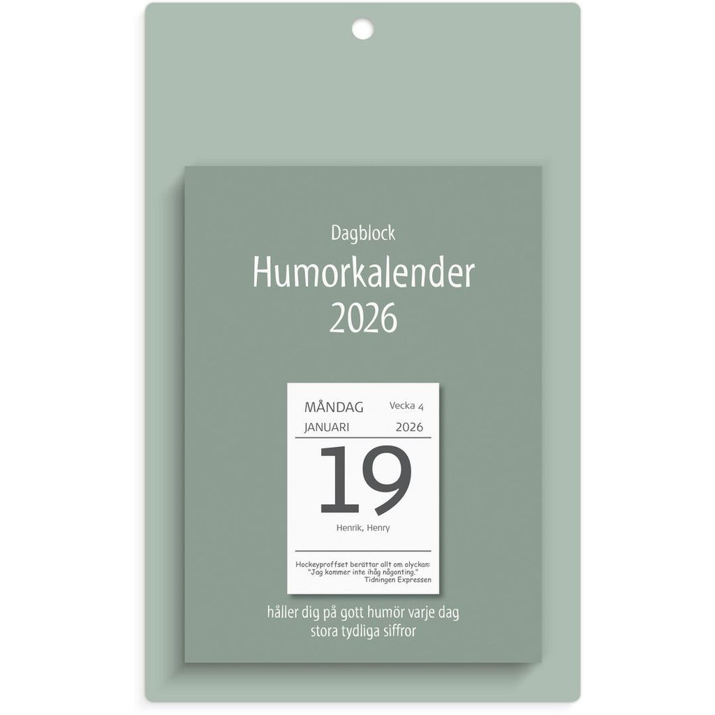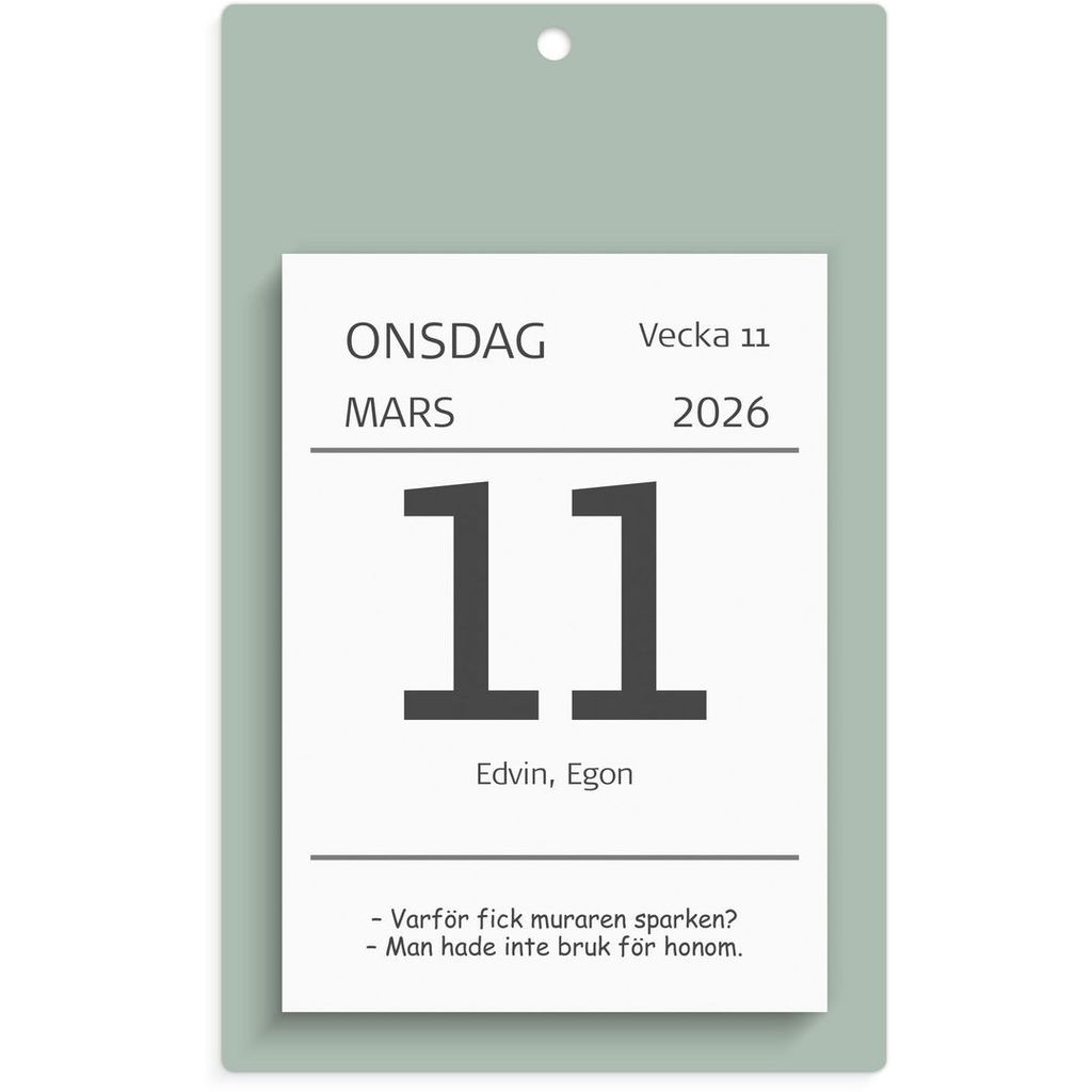 Följ året genom att riva av blad efter blad. Kalendern har ett väggplån som bakstycke och ett dagblock med stora siffror. Dagblocket har en vardag per blad och lördag och söndag på samma blad och är limbundet med klammerbaksida.