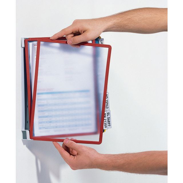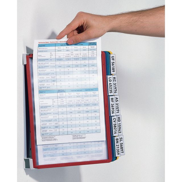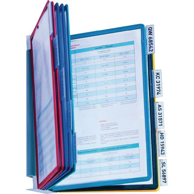Levereras med 10 ramar av polypropylen för 20 A4-sidor, i 5 färger, 2 av varje färg: Svart, röd, gul, grön och mörkblå) och 10st rubrikhållare (58 mm).