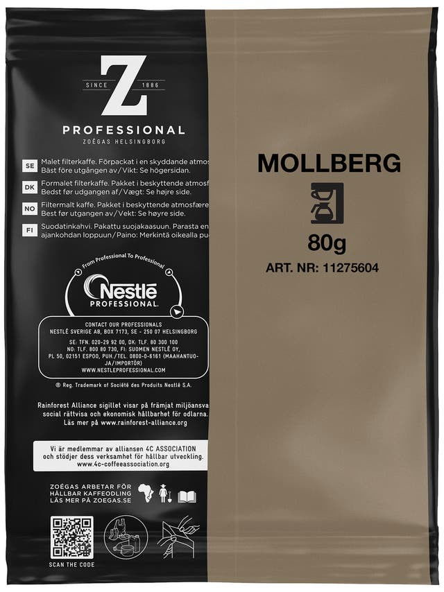 Zoégas Professional Mollbergs Blandning är en mustig mörkrost med elegant smak och toner av svarta vinbär och smörkola. Kaffet får sin arom och långa eftersmak från en stor andel högvuxna Kenyabönor som blandats med bland annat pärlbönor från Brasilien.